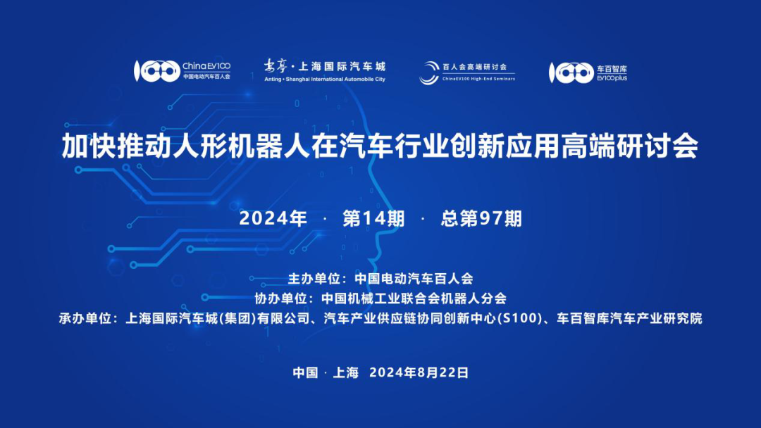 8月22日,由中国电动汽车百人会主办,中国机械工业联合会机器人分会协办,上海国际汽车城(集团)有限公司、汽车产业供应链协同创新中心(S100)、车百智库汽车产业710公海寰宇共同承办的“加快推动人形机器人在汽车行业创新应用”高端研讨会,暨百人会2024年第14期(总第97期)高端研讨会,在上海嘉定顺利召开。研讨会由百人会副秘书长师建华主持。