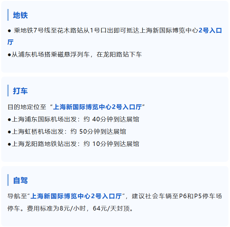 由上海新国际博览中心“2号入口厅”进入展馆(浦东新区龙阳路2345号,近地铁7号线花木路站),本次展会仅开放2号登录大厅(北厅),所有观众均在2号厅报到领取证件进入展馆。